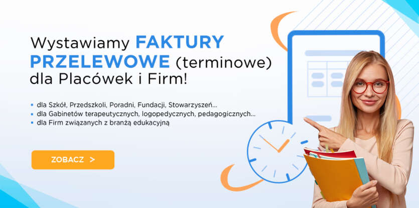 Oferujemy możliwość płatności przelewem (faktury terminowe z odroczonym terminem płatności, również wg nowych zasad związanych z centralizacją VAT) dla placówek, instytucji oraz firm związanych z działalnością edukacyjną, jak np. gabinety pedagogiczne, logopedyczne... Wystarczy, że zaznaczysz opcję "przelew" podczas składania zamówienia (opcja dostępna jest po zaznaczeniu w koszyku opcji "faktura").