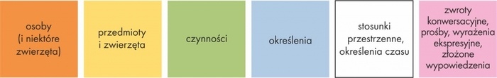 - różowy – zwroty konwersacyjne, wyrażenia ekspresyjne, złożone pytania.