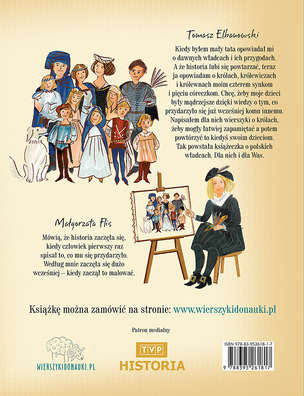 Wpadające w ucho wierszyki do nauki o władcach Polski ilustrowane pięknymi akwarelami Małgorzaty Flis. Autor, z wykształcenia historyk, opowiada o bohaterach i wydarzeniach z historii Polski w formie atrakcyjnej dla dzieci, bez żadnej daty.